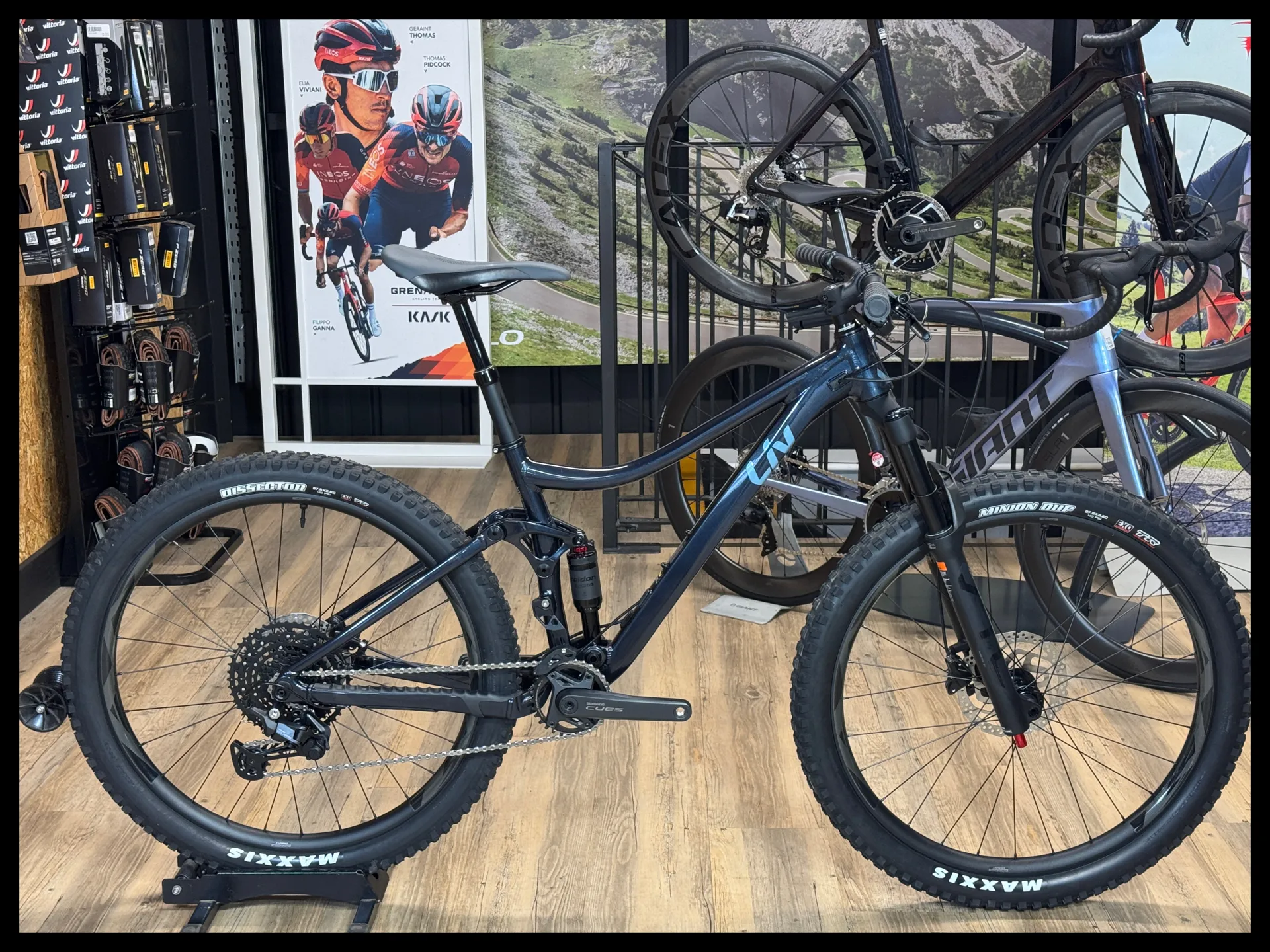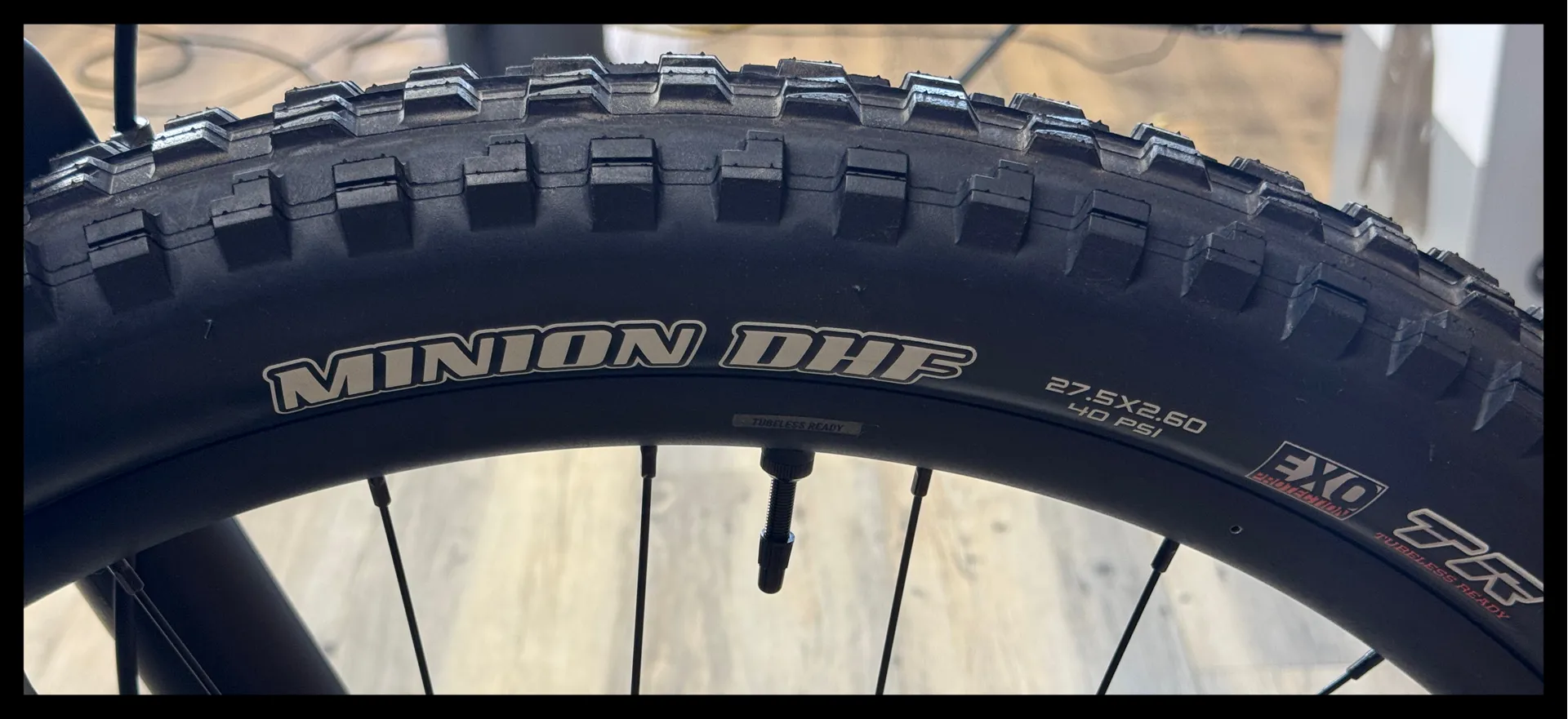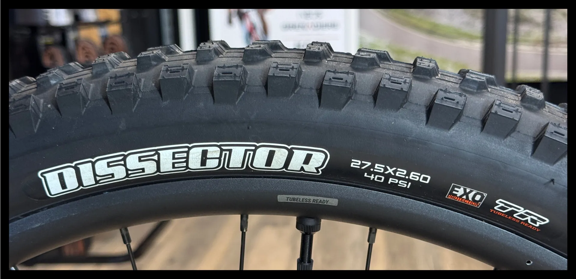 27.5": [F] Maxxis Minion DHF 27.5x2.6, EXO, TR, tubeless [R] Maxxis Dissector 27.5x2.6, EXO, TR, tubeless 29": [F] Maxxis Minion DHF 29x2.5 WT, EXO, TR, tubeless [R] Maxxis Dissector 29x2.4 WT, EXO, TR, tubeless