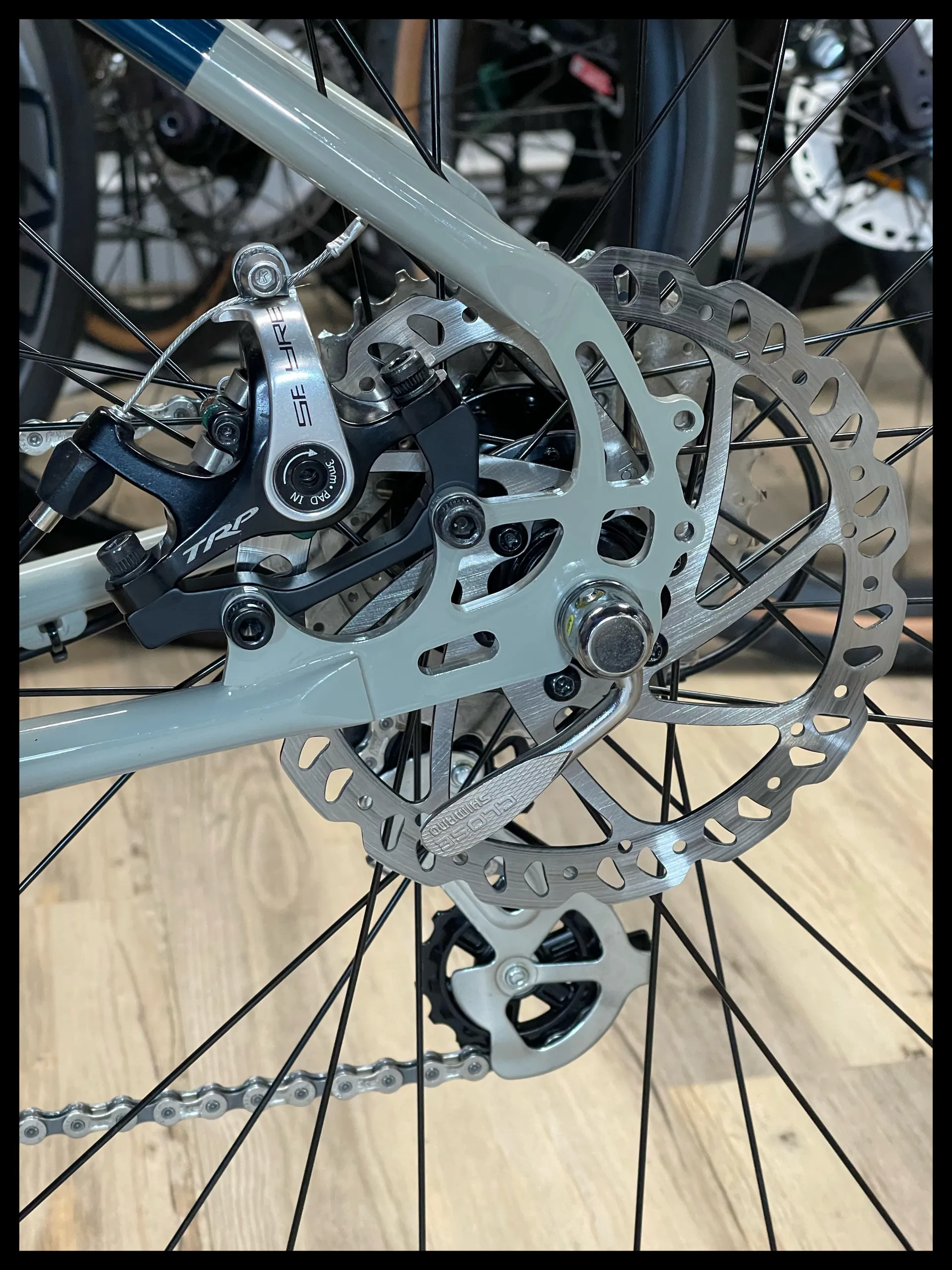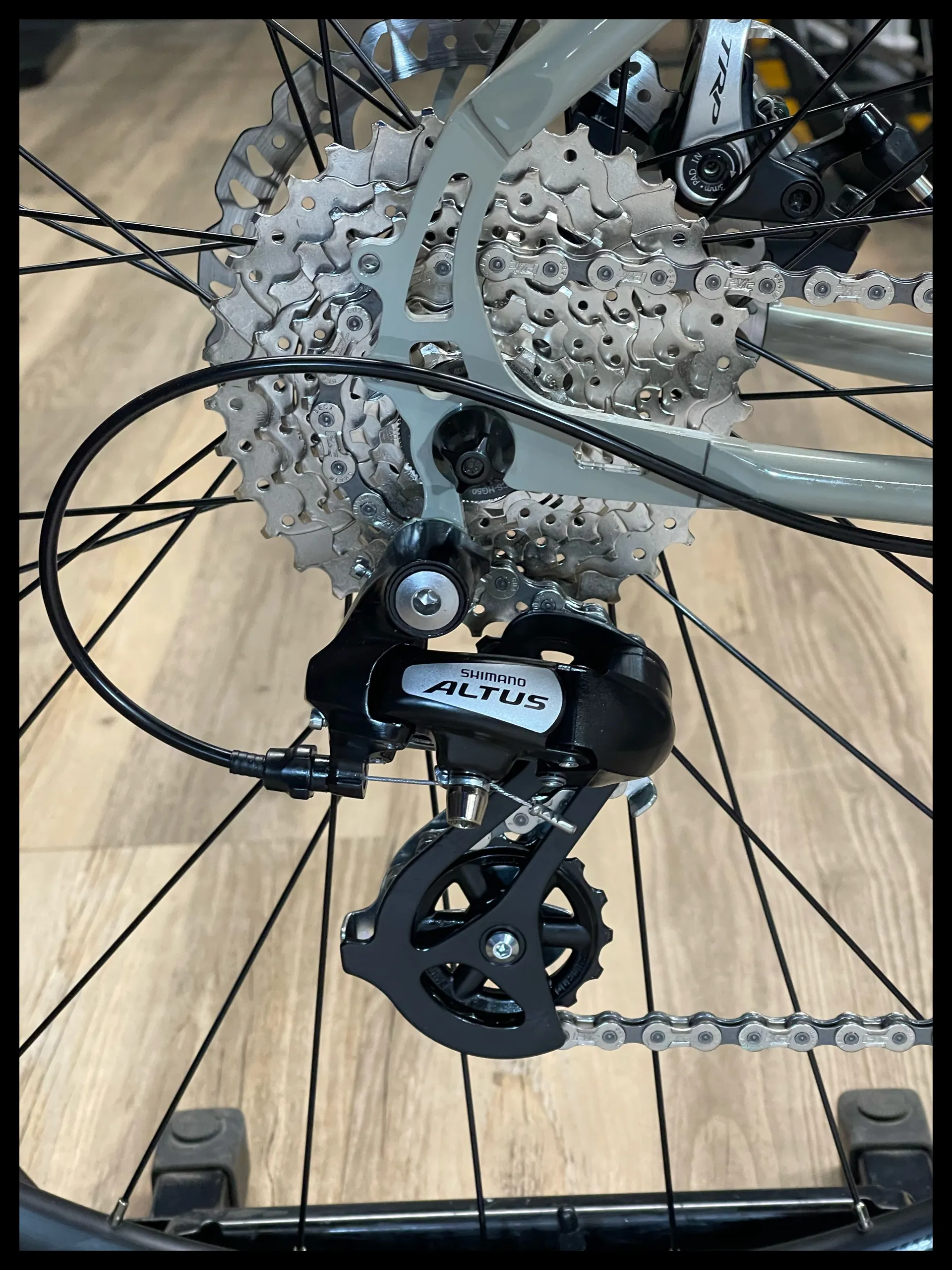 This former show room model is ready to ride and lloking for a permanent home where she'll be ridden with pride and style round town or down to the shops. Any questions please get in touch.With mechanical disc brakes. a 1 x 8 drivetrain and a 4130 Mjölnir cro-mo tubing frame , she is a very comfortable ride