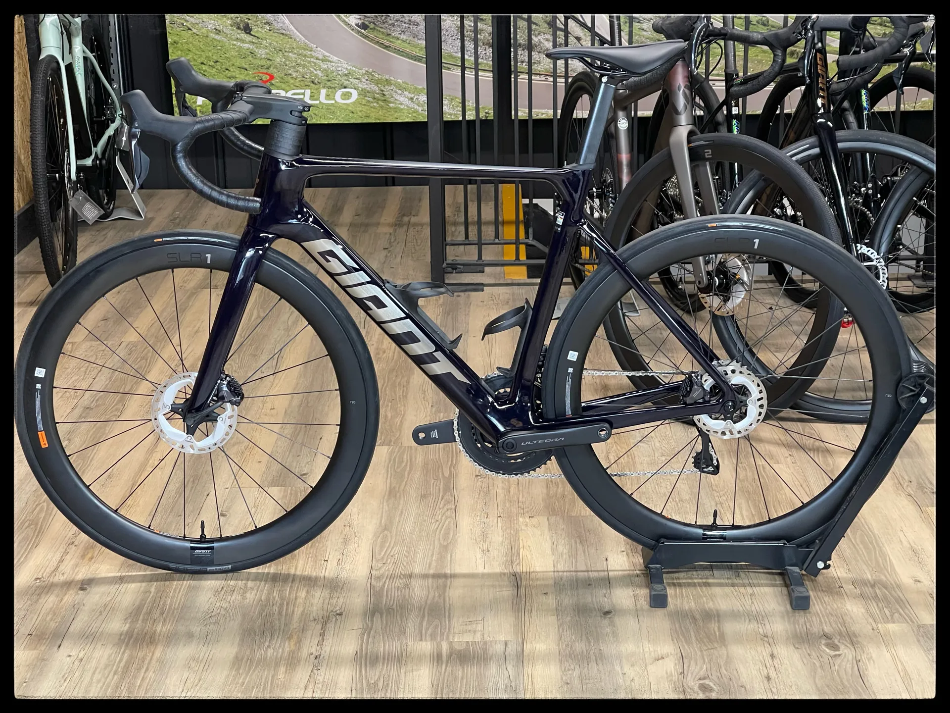 Out front computer mount for Garmin, Wahoo and Giant head units , water bottle cages, factory tubeless set up, 30mm max tyre size
